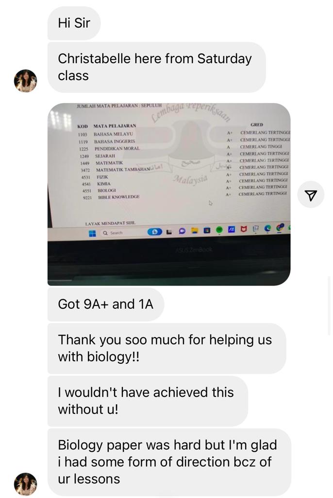 Now, in Aspire Education Online Tuition, we focus on providing top notch Online Lessons for SPM Pure Science and Math subjects. This could only be done by engaging tutors who are committed, responsible and most importantly affluent in their respective subjects. Thus, in the year 2023, we engaged Mr Brian Koo for SPM Physics, Ms Gwyneth for SPM Maths and Add Maths, as well as Ms Stella for SPM Chemistry. Rest assured, if you have the determination, I am sure they are more than capable in helping you obtain your ‘A’s. In 2025, we expanded our team of tutors to provide quality online tuition classes to Form 1 to Form 3 students as well!